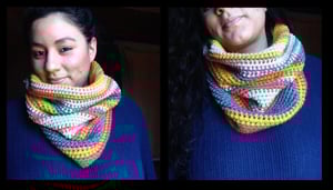 This handmade cowl is approximately 17x19. It's extremely warm and made with non-scratchy yarn ensuring a soft feel. The cowl's simple style makes it easy to wear with anything!